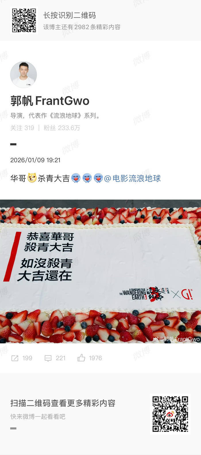 更让人激动的是,电影已经定档2027年大年初一,距离现在还有整整一年时间。网友们已经开始掰着手指头倒计时,有人开玩笑说“这一年要靠郭导的蛋糕文案续命”。不过玩笑归玩笑,从《流浪地球1》到现在,这个系列早就成了中国科幻的“门面担当”。这次刘德华杀青,剧组还悄悄放了个烟雾弹——没说他的角色是正是邪,也没提会不会有新的“数字生命”黑科技,这种“犹抱琵琶半遮面”的操作,反而让大家更期待了。现在全网最关心的,除了剧情就是那个“心机蛋糕”到底谁想出来的。有网友扒出郭帆导演的过往采访,发现他早就暴露了“段子手”属性,之前拍《流浪地球2》时就曾用“再改剧本就请吃火锅”督促团队。这次给华哥的蛋糕文案,怕是又要成为年度名场面了。不管怎样,能在紧张的拍摄中玩出这种幽默感,也难怪《流浪地球》系列能圈粉无数——毕竟谁不爱看一群认真搞科幻的人,偶尔露出可爱的一面呢?